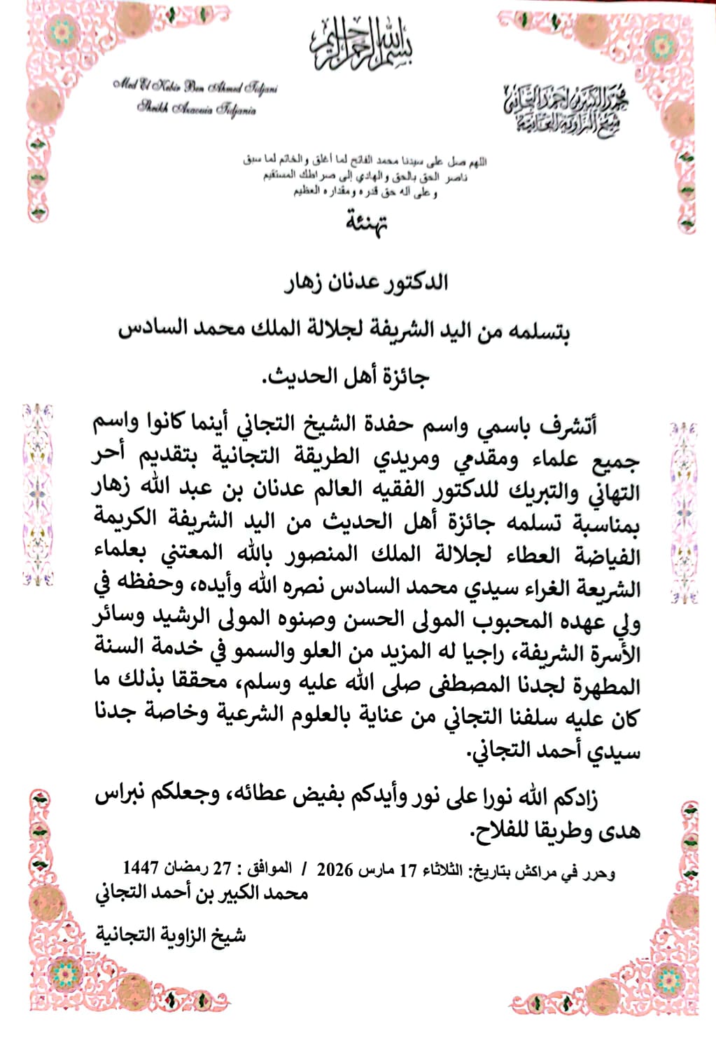 أتشرف باسمي واسم حفدة الشيخ التجاني أينما كانوا واسم جميع علماء ومقدمي ومريدي الطريقة التجانية بتقديم أحر التهاني والتبريكات للدكتور الفقيه العالم عدنان بن عبد الله زهار بمناسبة تسلمه جائزة أهل الحديث من اليد الشريفة الكريمة الفياضة العطاء لجلالة الملك المنصور بالله المعتني بعلماء الشريعة الغراء سيدي محمد السادس نصره الله وأيده، وحفظه في ولي عهده المحبوب المولى الحسن وصنوه المولى الرشيد وسائر الأسرة الشريفة، راجيا له المزيد من العلو والسمو في خدمة السنة المطهرة لجدنا المصطفى صلى الله عليه وسلم، محققا بذلك ما كان عليه سلفنا التجاني من عناية بالعلوم الشرعية وخاصة جدنا سيدي أحمد التجاني.